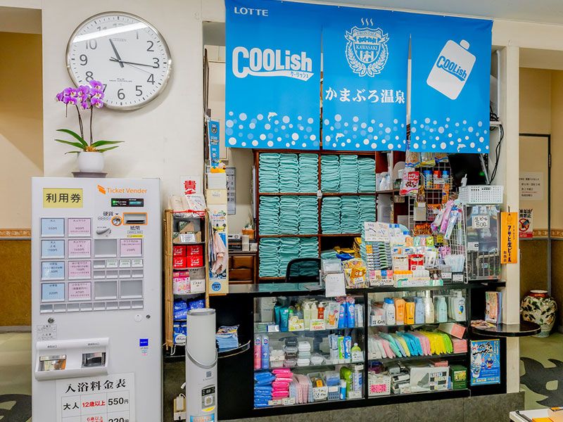 サウナ(有料)をご利用の方にはバスタオル・小タオルが付きます。洗顔料や化粧水の販売もあります。