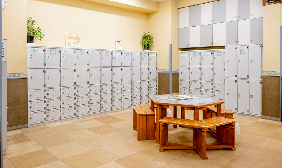 清潔で広々とした脱衣所、鍵付きロッカー完備。