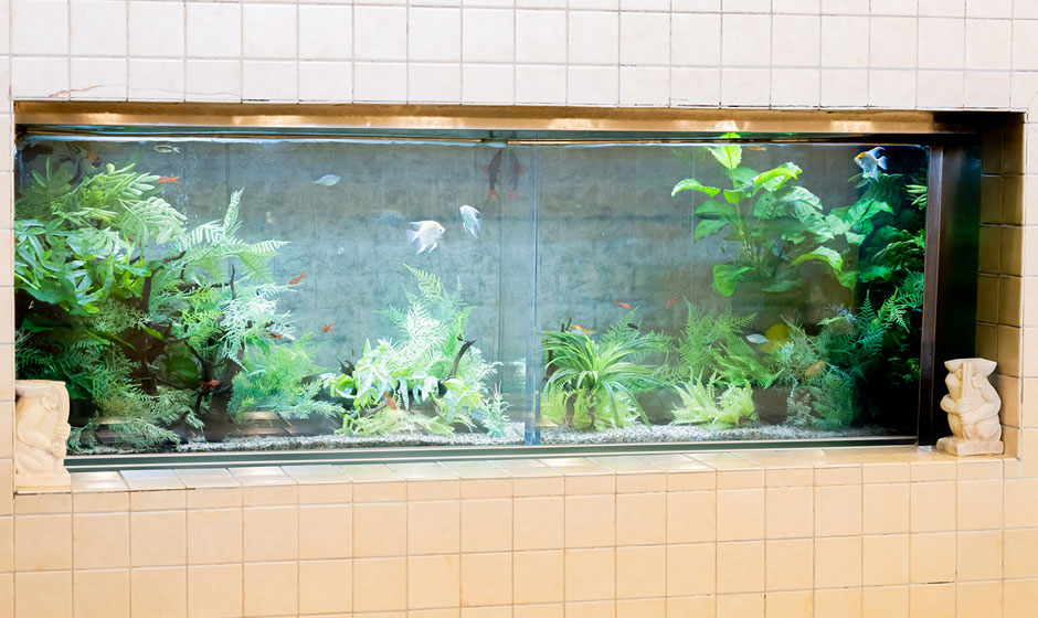 お風呂の壁には淡水魚の水槽があります。